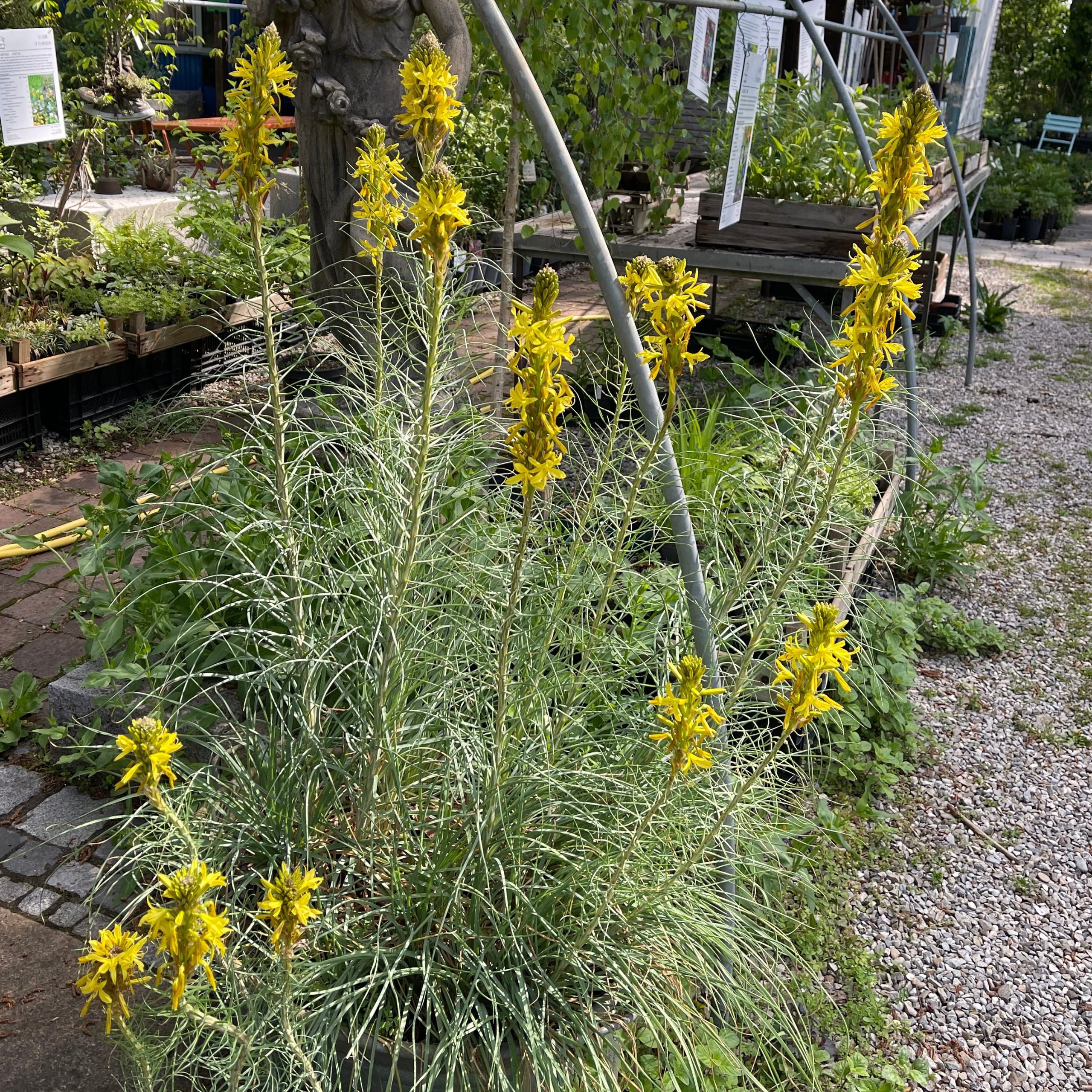 Diese aus dem Mittelmeergebiet stammende Staude ist ein Hingucker für jede Steppen- und Steingartenanlage. Die sehr schönen, sternförmige gelben Blüten, sitzen auf einem bis zu 100cm langen und beblätterten Schaft. Gute Fernwirkung! Das grasartige graugrüne Laub ist wintergrün, gelegentlich zieht es in trockenen Sommern ein.