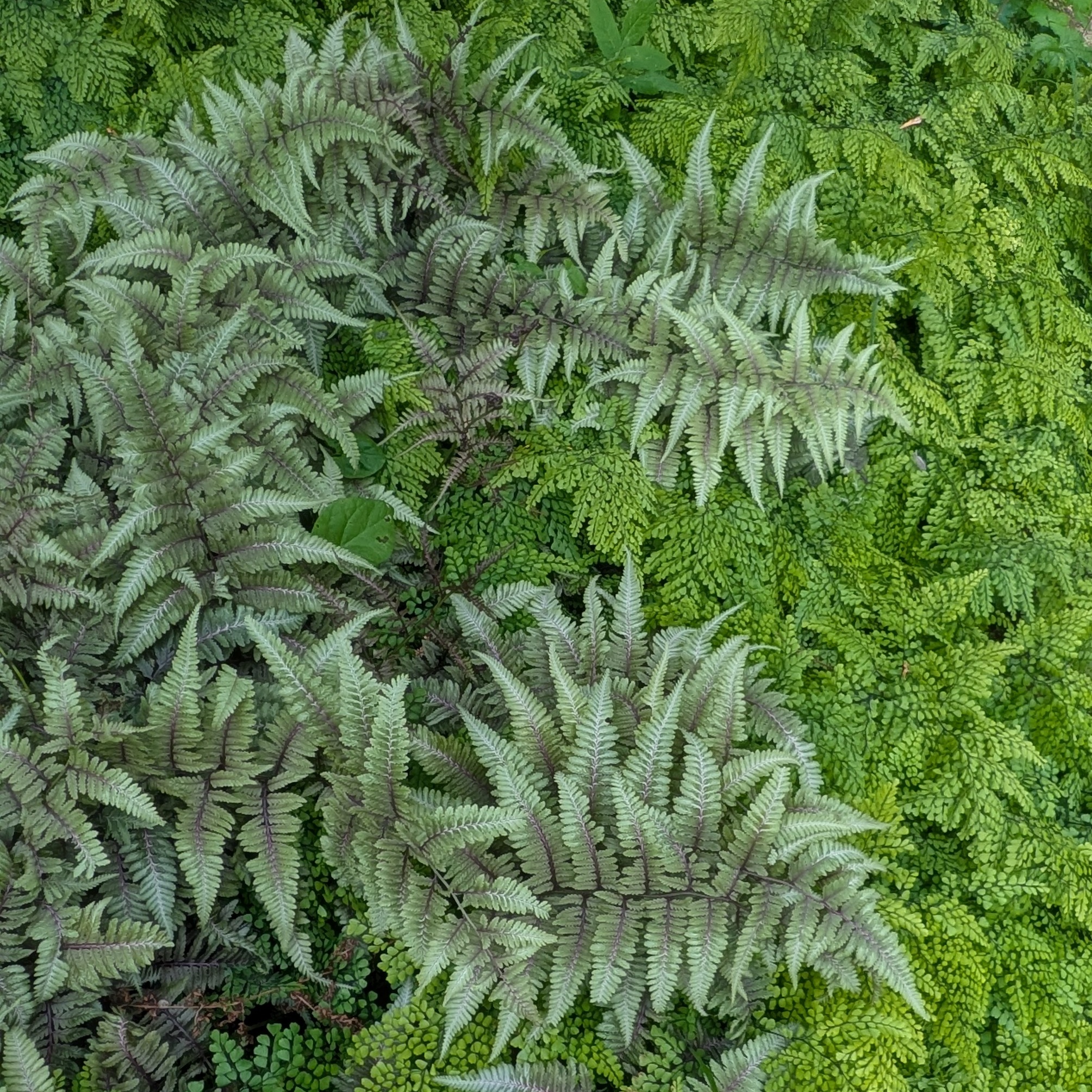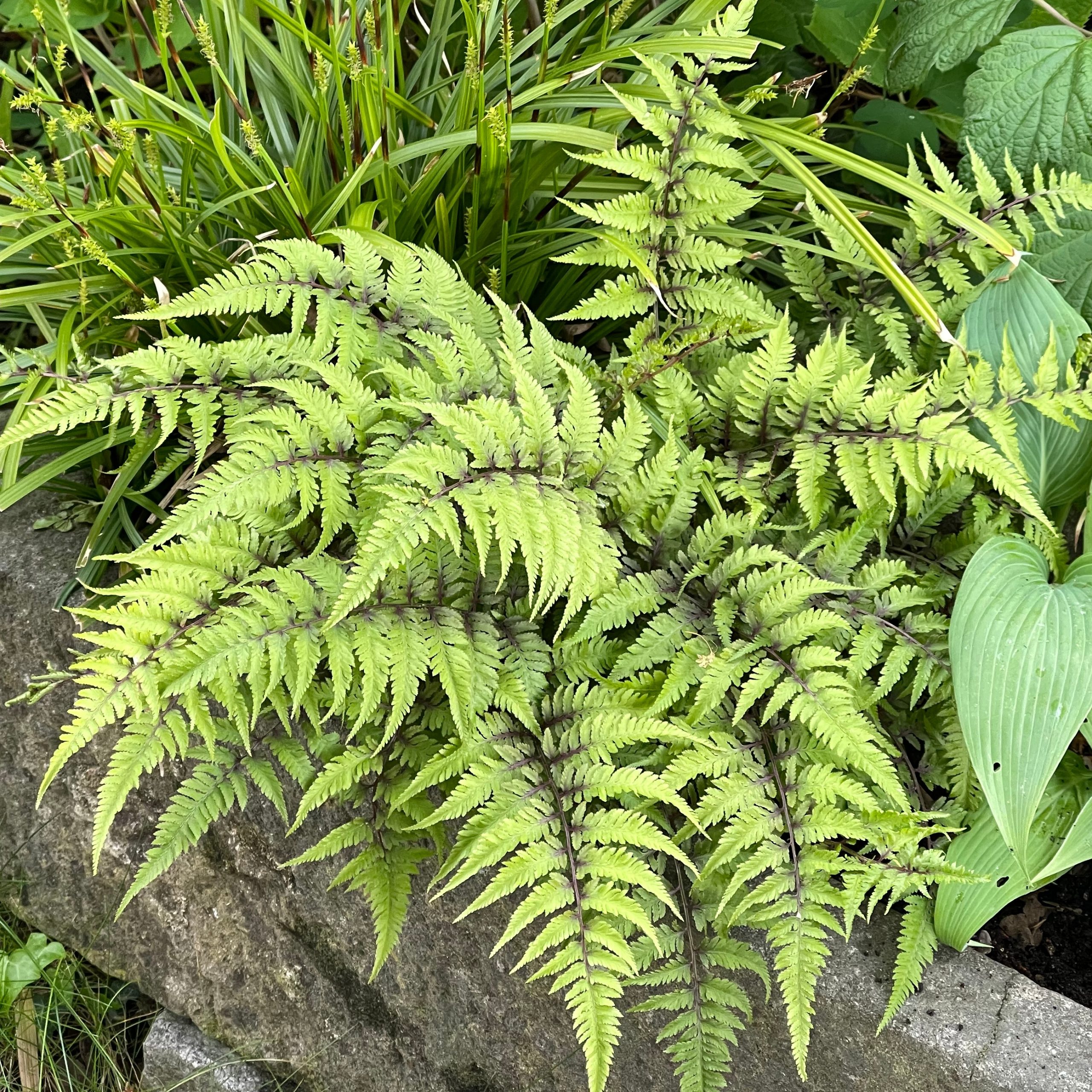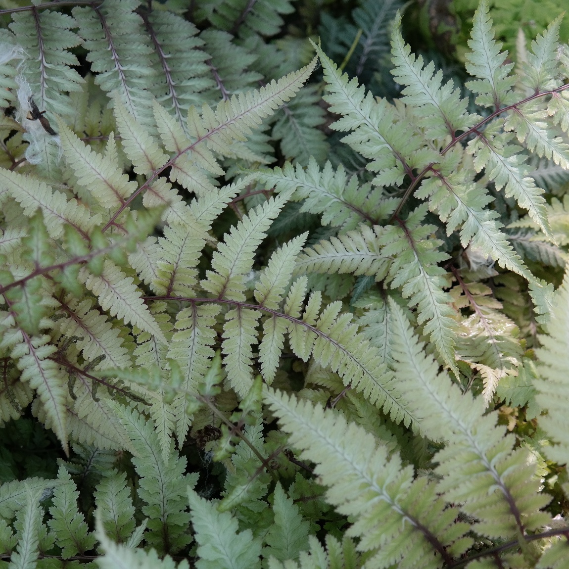 Wedel auffallend silbrig und rötlich gezeichnet, sommergrün. Einer der schönsten u. auffälligsten Farne, für dauerhaft frische, geschützte Standorte mit eher saurem Boden.