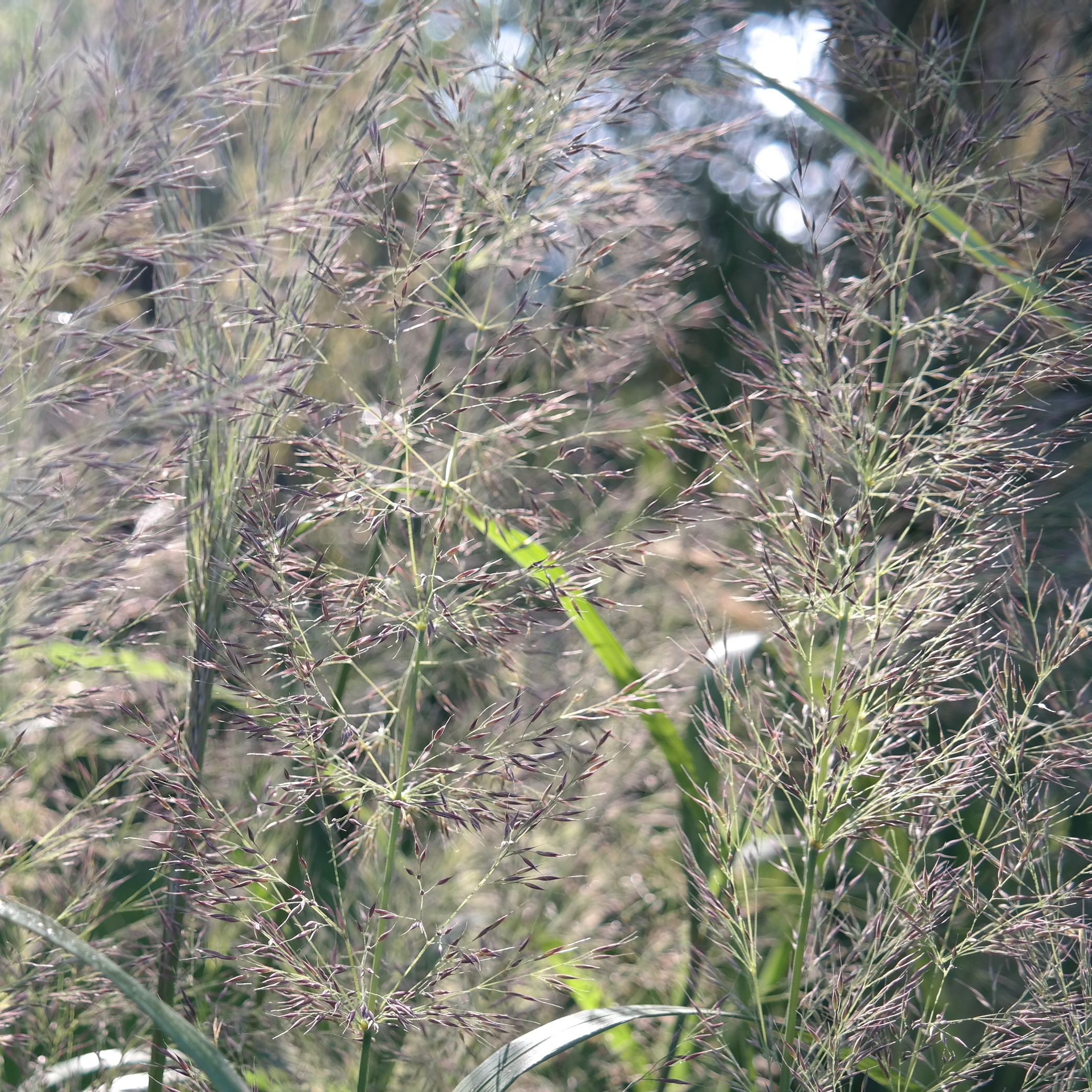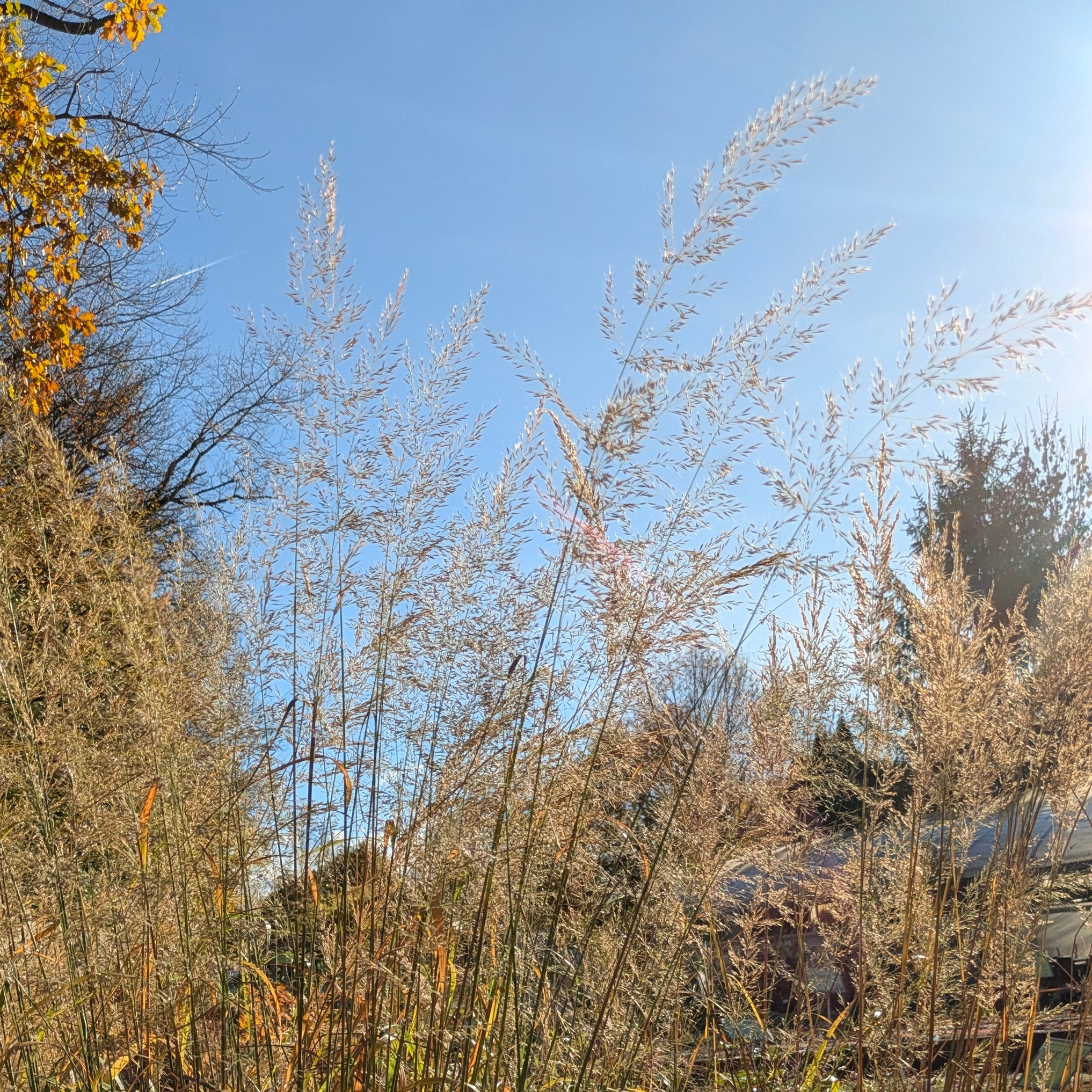 Spätblühende Reitgras-Neueinführung aus Südkorea. Blüten locker, anfangs rosa überhaucht, weitgefächert; Laub relativ breit, schöne gelbe Herbstfärbung; gut winterstandfest; eng mit dem Diamantgras verwandt, aber breiteres Blatt und lockere Blüte.