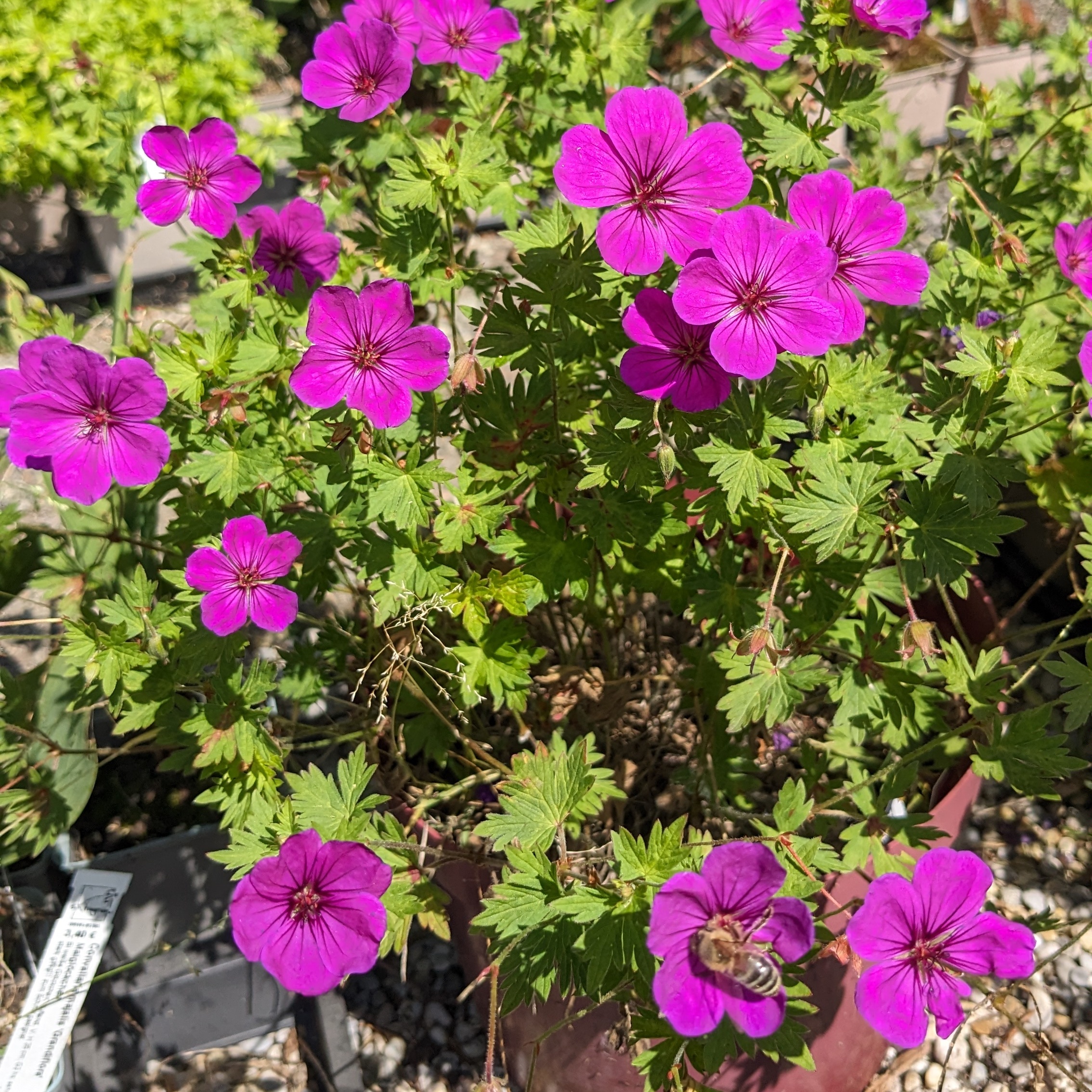 Sehr farbkräftiger, leuchtender Storchschnabel mit dunkel magentaroten Blüten und zarter Aderung. Kreuzung aus G. sanguineum und psilostemon. Entwickelt sich eher langsam, belohnt die Geduld aber mit reicher Blüte. Eignet sich mit seinem kompakt halb-kugeligem Wuchs als zierlicher Bodendecker im Vordergrund von sonnigen Beeten sowie in Balkonkästen und Trögen