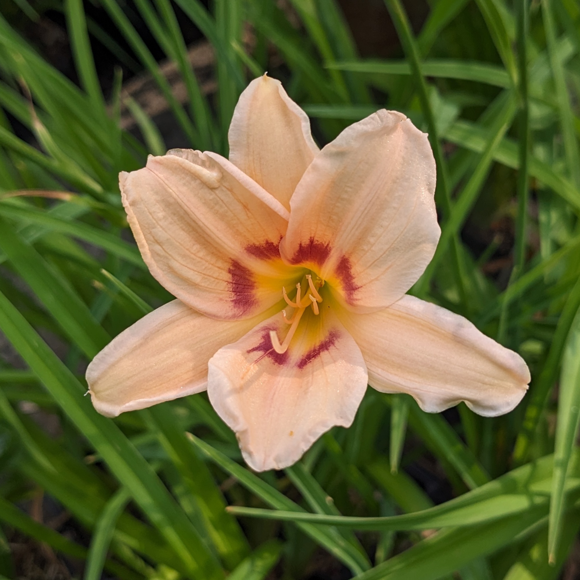 Aparte kleinblumige Sorte mit apricot-rosa Blüten mit purpurviolettem Auge und gelbem Schlund. Hübsche Sorte für pastellige Beete und Blumensträuße