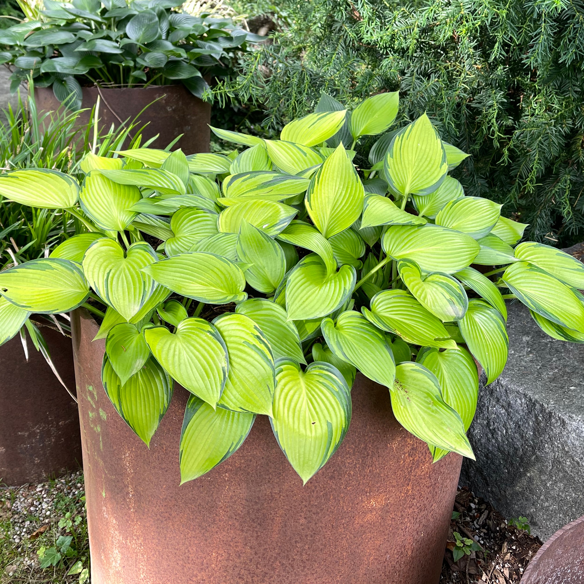 Sehr schöner Sport (Abkömmling) von ‚June‘. Sie hat eine sehr feste Blattsubstanz und ist deshalb gut schneckenresistent und sonnenverträglich. Im Austrieb, sowie an sonnigeren Standorten glänzend gelb bis gelbgrün, im Schatten vergrünt das Laub zu einem wunderschönen Limettengrün.
